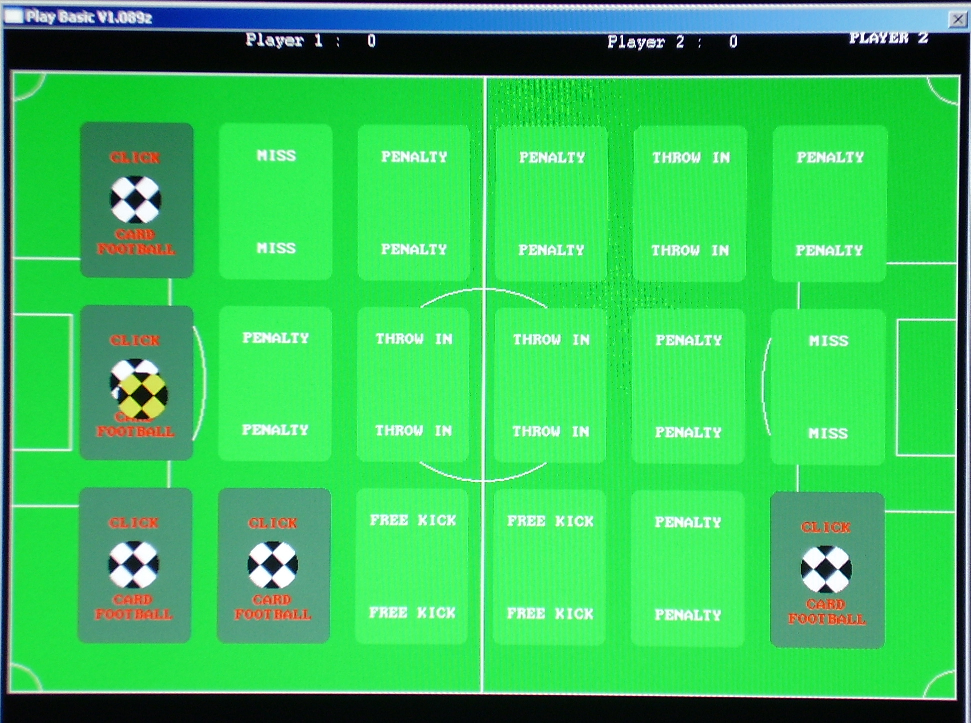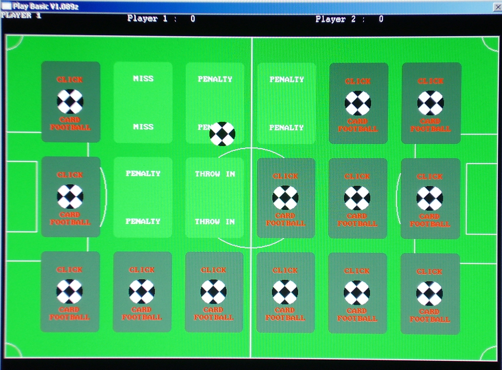 This little game is based on football but played by taking it in turns to select cards, displayed face down on the pitch. This is my first game written using the playbasic editor, its not fantastic, but it works !!! |